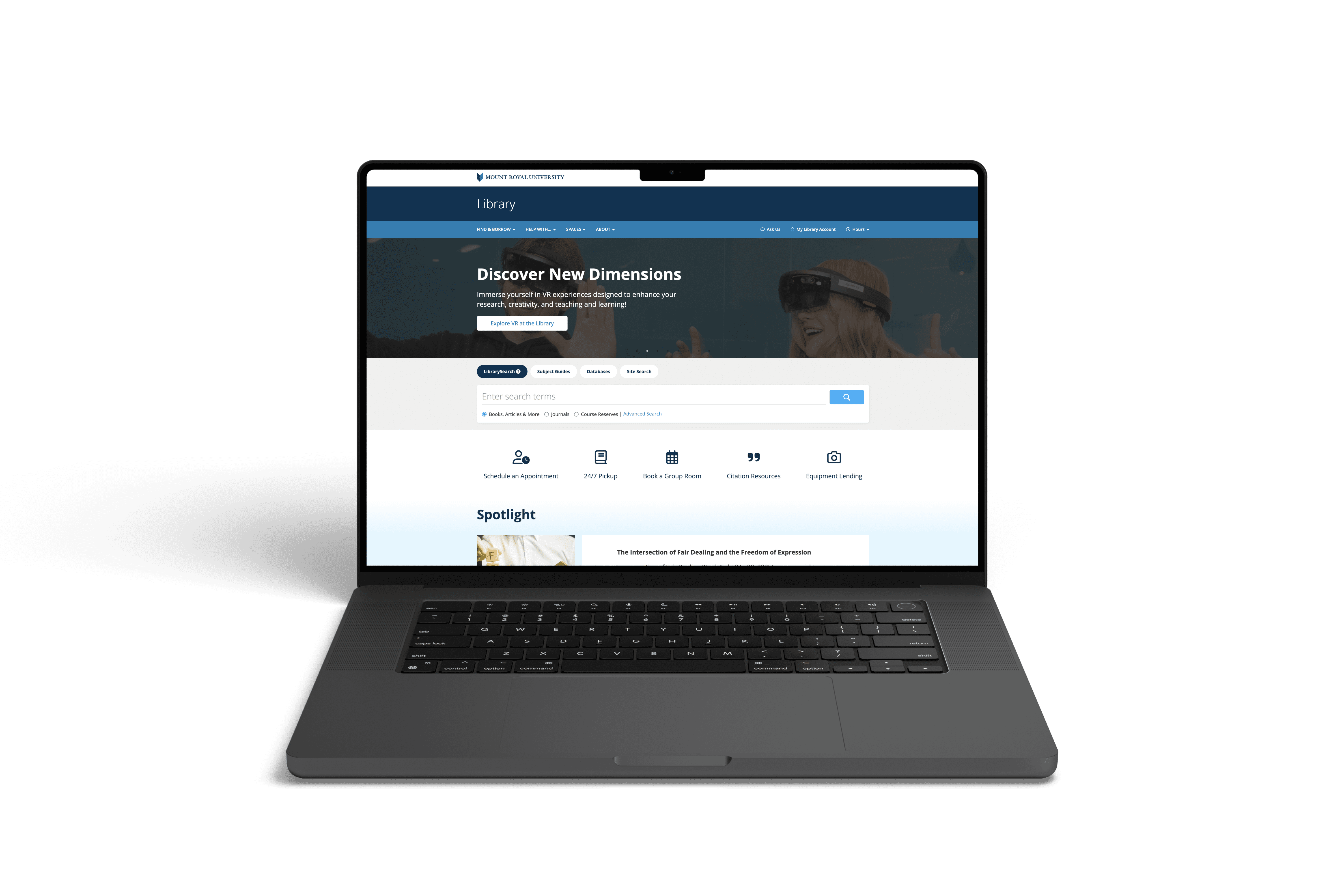 As a UI Developer at Mount Royal University, I worked in a cross-functional team within the Library’s digital initiatives department. My role spanned design and development—from early-stage research and wireframing to front-end implementation, analytics, and optimization.